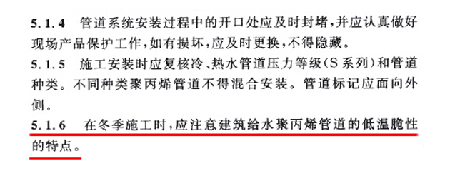关于PPR管的低温脆性,相关国家规范做出了详细的说明。由建设部批准的《建筑给水聚丙烯管道工程技术规范》就针对PPR管的这一特性,对PPR管的贮运、施工做出了明确的要求。